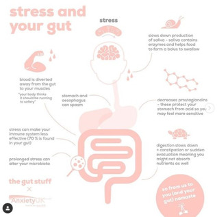 Terrifyingly enough, almost every part of your body can be impacted due to stress but the main issue you can encounter is a weakened immune system. Put simply, you're more prone to getting run down and picking up viruses, which can lead to even more fatigue and a lack of concentration: it's a vicious circle. What I didn't realise is how badly stress can effect your digestive system as well - my Crohn's was diagnosed due to a prolonged level of stress, acting as a trigger in my condition, but although IBD (irritable bowel disease) is somewhat reliant on genetics, IBS (irritable bowel syndrome) numbers are growing almost entirely due to extreme stress. Thanks to @thegutstuff (a super helpful page I recently found on Instagram) we can see very clearly how this all works...